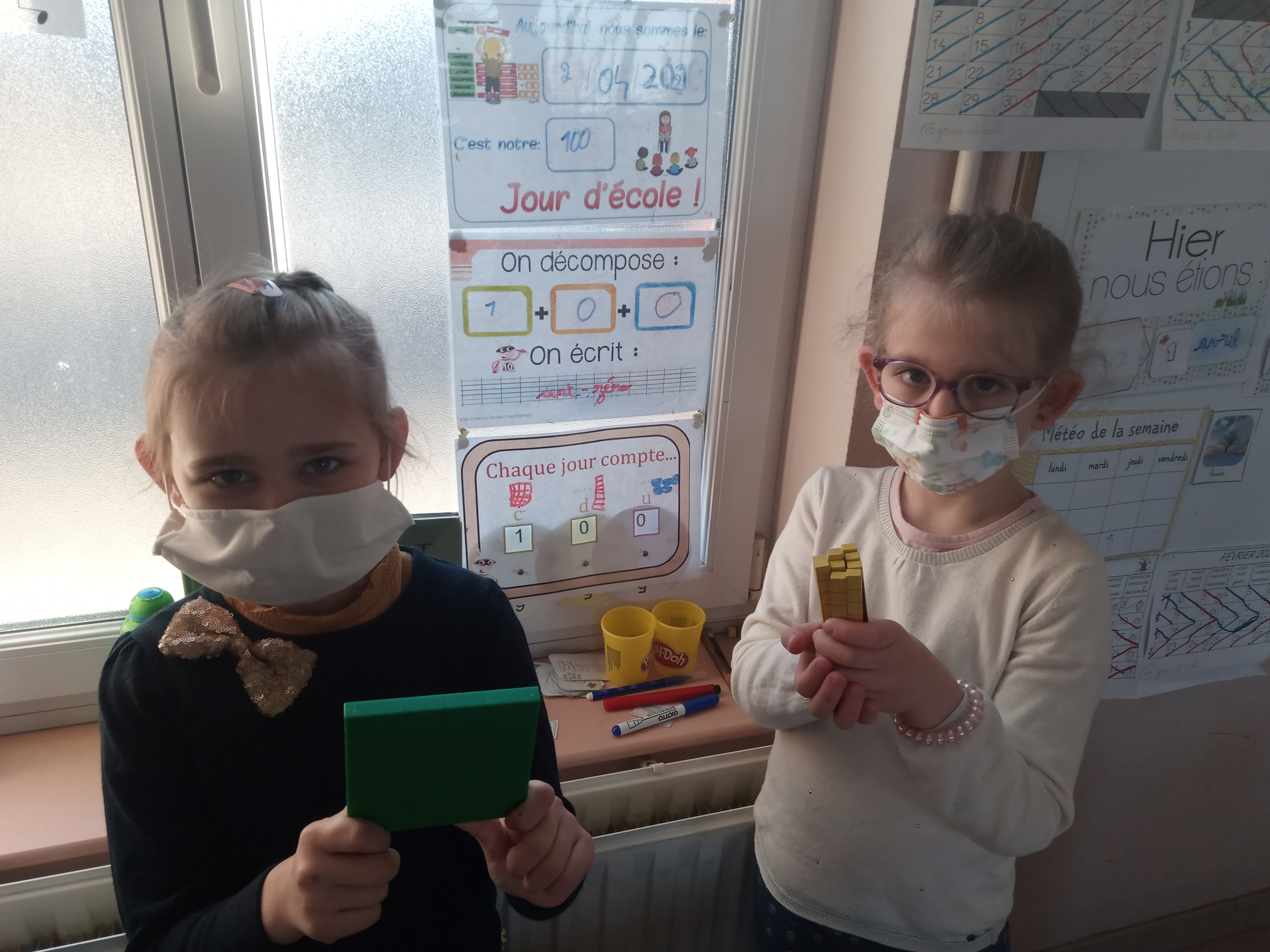 Depuis le début de l’année scolaire, les CP comptent les jours d’école, cela fait partie des rituels du matin, en même temps que la date : chaque jour, un élève responsable ajoute un cube unité. « Quand on a 10 unités, on les échanges contre 1 dizaine », ça aide les élèves à bien comprendre le système décimal.