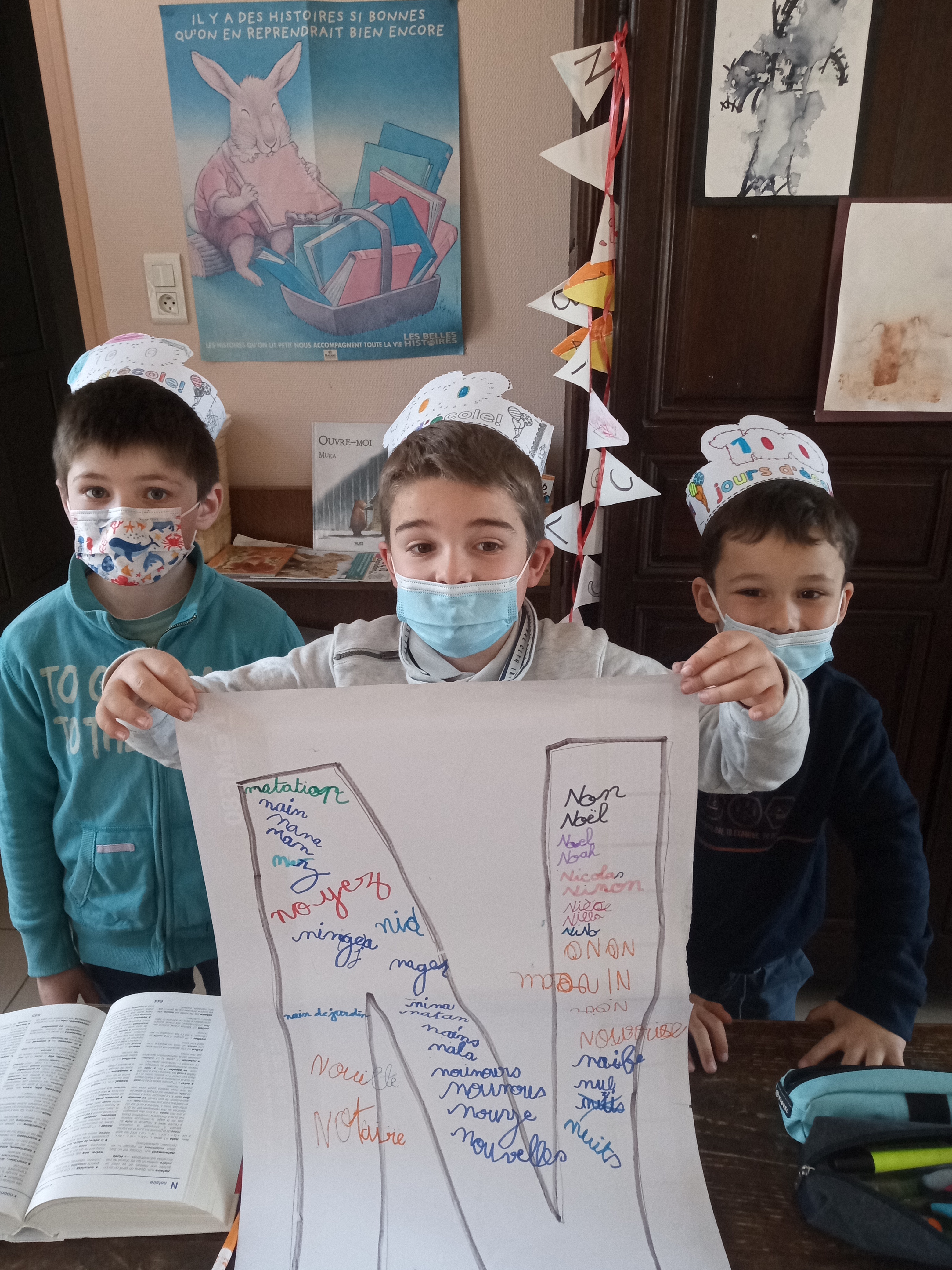 Après-midi récréative : peinture, livrets de jeux du 100ème jour et jeux de cartes, puis dépouillement des votes pour le concours de dessins, remise des récompenses (un beau marque-page pour chaque participant), et enfin goûter et récitation d’une poésie (en groupes).