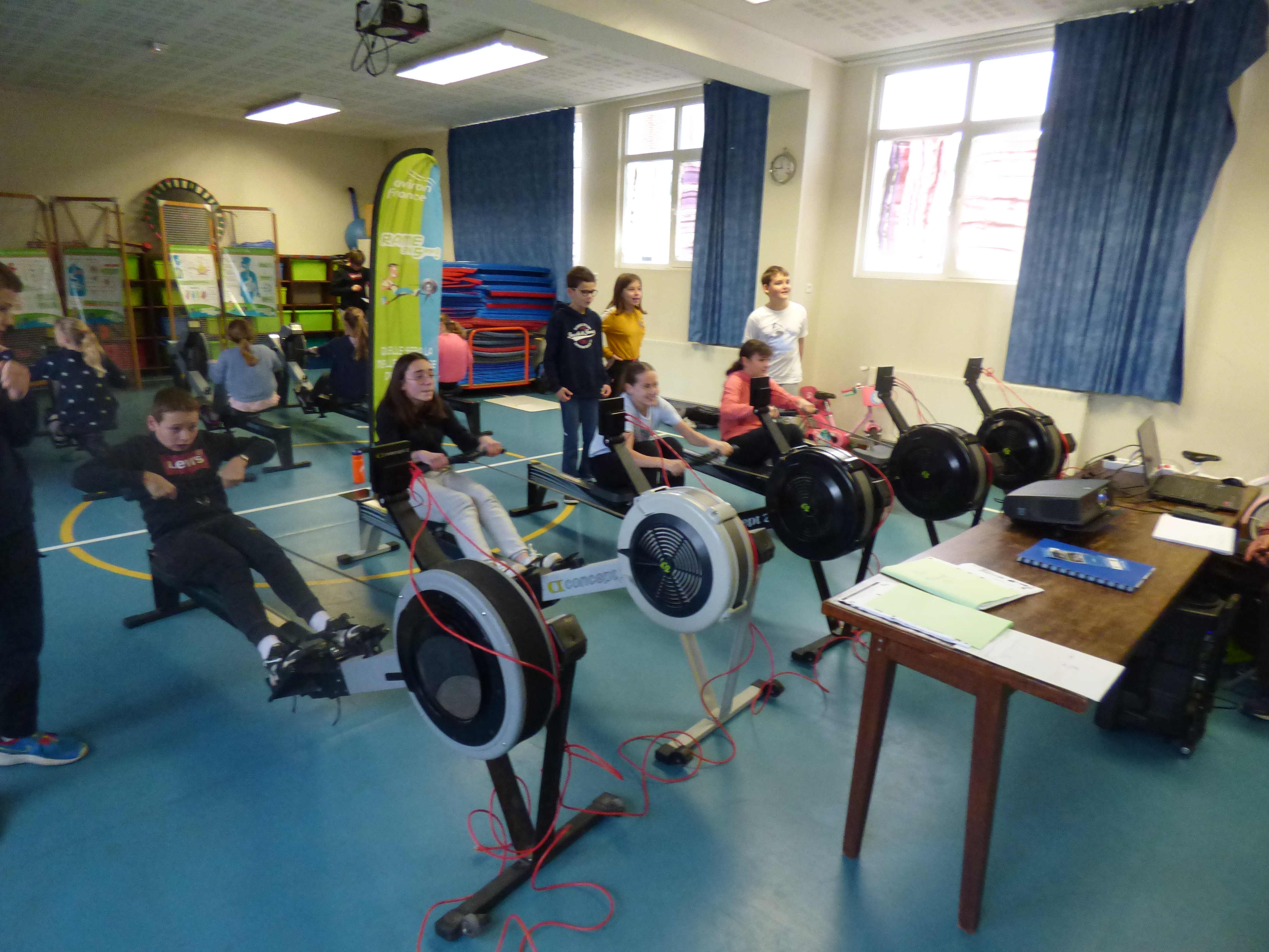 Rame en 5ème s’articule autour d’une séance d’aviron indoor et d’ateliers SVT sur le fonctionnement du corps humain abordant différents thèmes (digestion, apports et dépenses caloriques, appareils respiratoires et cardio-vasculaire…).
