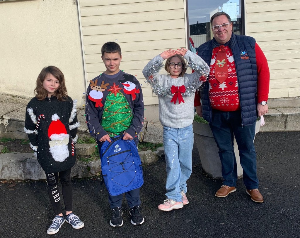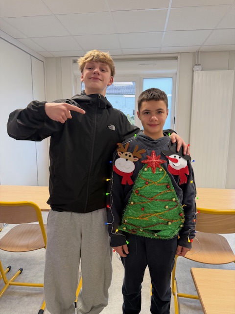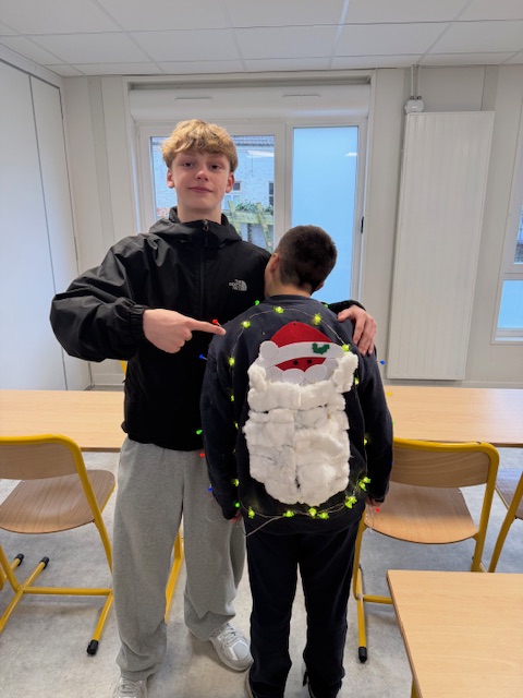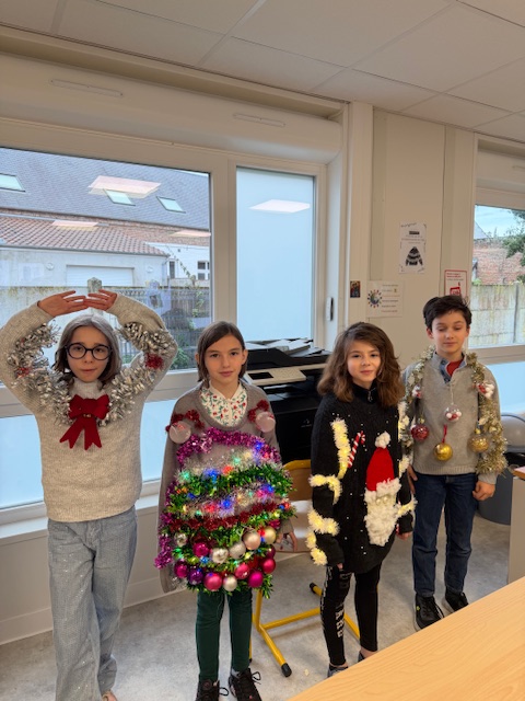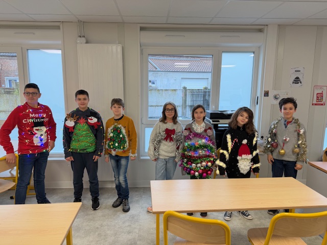 Résulats du concours de Pull de Noël fabriqués par les élèves:1er Corentin 5°2ème Kelly 6°3ème Garance 6°